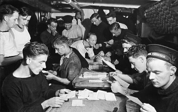 Some of the crew of HMS Minesweeper Commiles, adopted by the Daily Mirror reading their fan mail. Over 1000 letters were received by the crew within a month following adoption. The only person whom frowns is the shore based censor. 15th September 1942 c/o Memory Lane UK