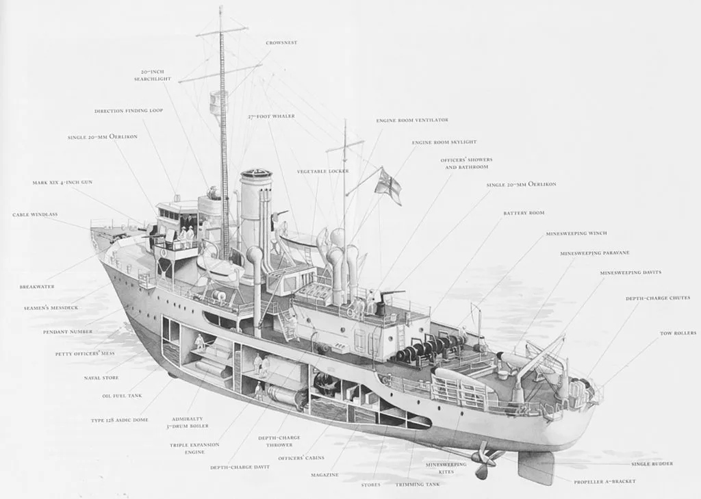 The Ex HMAS Junee was one of sixty Australian Minesweepers (commonly known as corvettes) built during World War II in Australian shipyards as part of the Commonwealth Government’s wartime shipbuilding programme. Twenty were built on Admiralty order but manned and commissioned by the Royal Australian Navy. Thirty six (including Junee) were built for the Royal Australian Navy and four for the Royal Indian Navy.