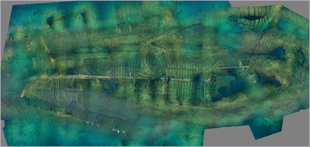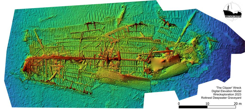 Sitting on the sand at around 65m, coming up 2m from the seabed. The wreck was always thought to be 45-50m long, the survey showed this to actually be 62m.. This wreck is dived fairly regularly as an introductory deep technical dive, so it is surprising that it has not yet been formally identified.