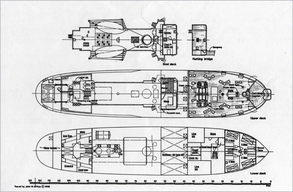 Built in Middlesbrough, England in 1929 and given the name Kos VII. She was then hired as a Mine Sweeper in World War II and was renamed to the Daybreak. In 1945 she returned to her original owners and was renamed back to the Kos VII.